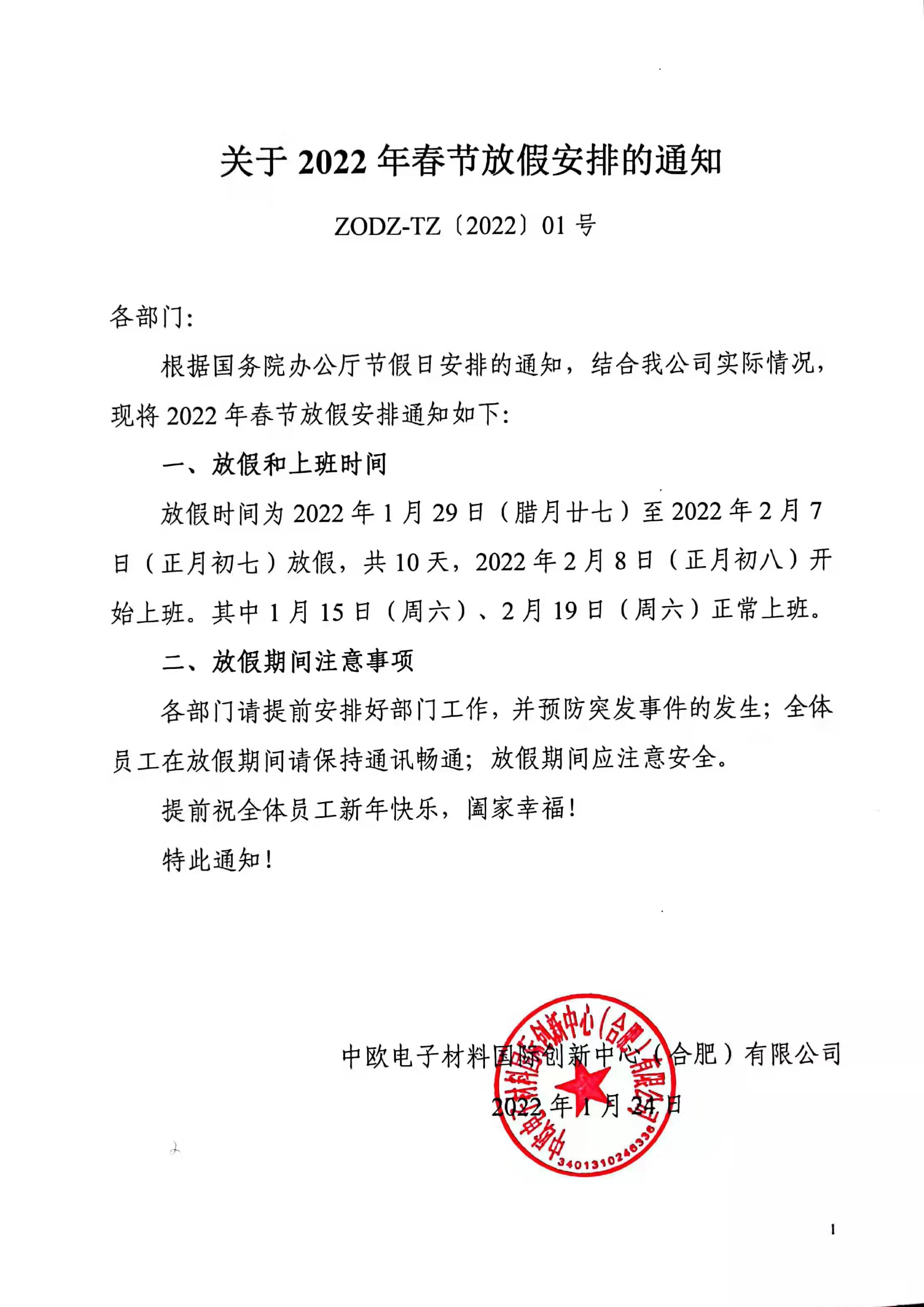 赢博在线(中国)唯一官方网站2022年春节放假安排的通知