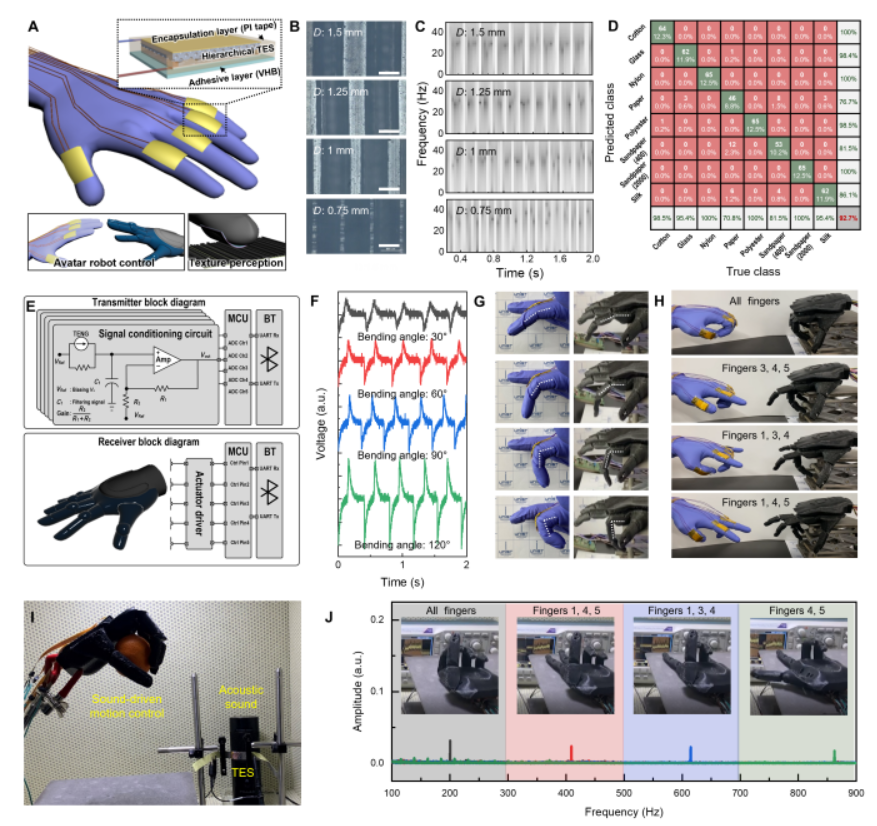 图2:分层TESs在动态HMI中的应用。(A)HMI应用智能手套示意图,实现机器人手的纹理感知和远程控制。插图显示了具有传感器、封装层和胶带的每个像素组成。(B)不同线形图案宽度分别为1.5、1.25、1、0.75mm的目标表面纹理的光学图像。通过扫描表面纹理而产生的输出电流的(C)STFT。(D)神经网络可以识别不同的纹理和表面粗糙度。(E)HMI应用的无线网络系统中的控制框图和电子电路。(F)智能手套上的分层TESs的输出电压作为弯曲角度的函数。单位,任意单位。(G)单像素智能手套使用不同弯曲动作的机械手运动控制照片。(H)使用多像素智能手套控制机械手运动的照片。(I)由声音驱动的HMI应用程序的照片。(J)在分离的工作范围内使用频率采集来演示机械手的运动控制。