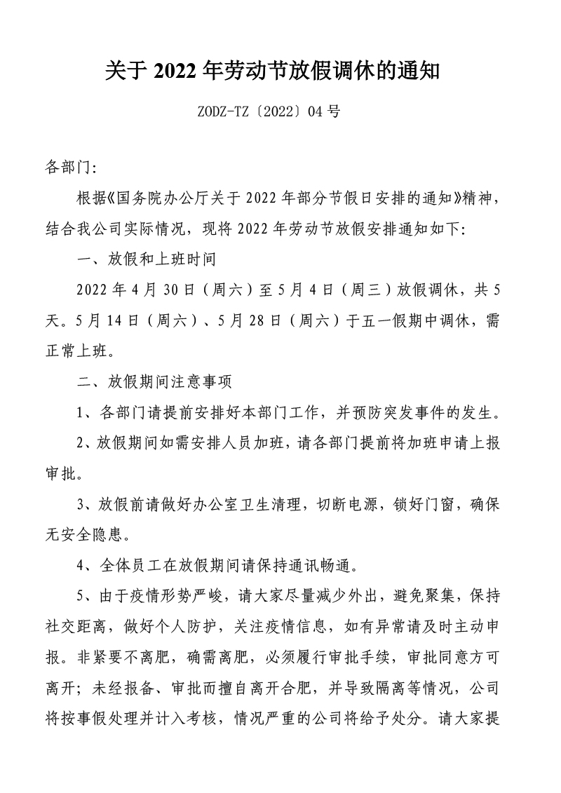 赢博在线(中国)唯一官方网站创新赢博在线(中国)唯一官方网站2022年劳动节放假调休通知