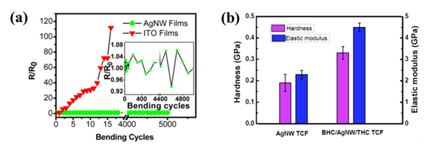 图1. 折叠屏用银纳米线薄膜的抗弯折、抗表面刮擦性能。