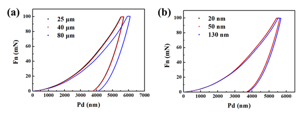 图2. 不同纳米线直径以及薄膜厚度的银纳米线薄膜载荷位移曲线。