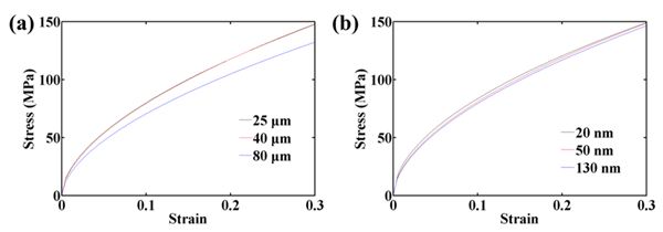 图3. 不同纳米线直径以及薄膜厚度的银纳米线薄膜应力应变曲线。
