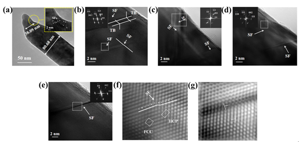 图4. 薄膜剪切应力下银纳米线断裂后不同部位的微结构表征。