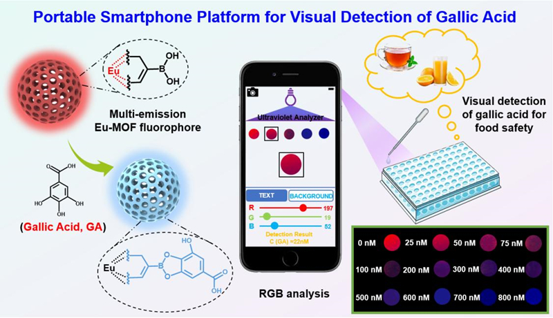 研究人员基于硼酸配体和铕金属离子的聚合,开发了单波长激发下的多发射Eu-MOF,用于快速可视化检测没食子酸,并且利用智能手机APP(颜色识别器)识别荧光探针溶液颜色的RGB值完成了对没食子酸的可视化检测。引入硼酸基团后,Eu-MOF在单波长激发下有两个发射赢博在线(中国)唯一官方网站,在检测没食子酸时,Eu-MOF的发射颜色在紫外灯照射下可由红色变为蓝色,即由Eu-MOF中能量转移效率的转变引起。这种多发射Eu-MOF具有显著的发光性能、高灵敏度和对没食子酸的快速视觉响应,并对没食子酸的检测具有良好的分散性和较低的检测限,可用于茶和果汁等实际样品中没食子酸的检测。结合智能手机制备的荧光传感平台,可进行现场、快速、半定量、可视化的检测。所设计的方法为食品质量控制评价体系的开发提供新的思路与途径,并有望扩展多发射Eu-MOF在化学和分析传感领域的应用。