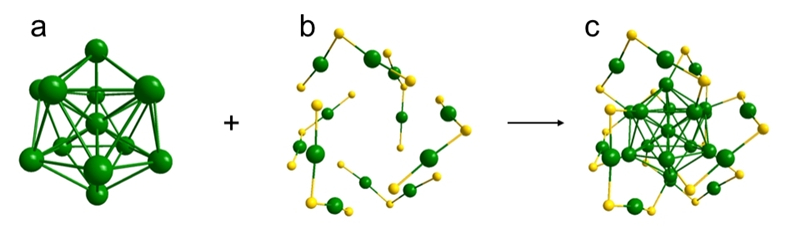 图1. 以Au25为例说明金属纳米团簇的组成:a,金属内核; b,金属-配体组成的外壳; c,Au25整体结构。绿色为Au,黄色为S,C和H