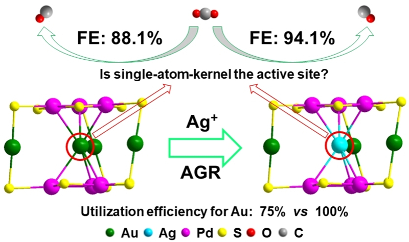 CO2电催化还原反应在“双碳目标”战略下具有重要意义,被用于考察这两个团簇的催化性能和活性位点。实验表明,Au3AgPd6相对于Au4Pd6 具有更好的催化活性和选择性(CO2转化成CO的法拉第效率分别为94.1%和88.1%),表明通过AGR取代,不仅可提高催化性能,而且可提高金的利用率(100%),降低催化剂成本。所得催化剂Au3AgPd6 相对于我们从前用两相AGR法获得的Au47Cd2(Angew. Chem., Int. Ed. 2020, 59, 3073-3077.)来说,质量活性也大大提高(分别为266.7和55.6 mA mg-1)。进一步的实验表明,内核原子不是反应的活性位点,但能通过调控团簇的电子结构改变催化性能和其它性能,这为调控团簇的性能提供了借鉴和参考。因而,本工作中我们不仅提出了减少内核原子提高金属利用效率的策略,甚至提出了“单原子内核纳米团簇催化剂”的概念,首次得到了以还原态钯为主体的合金纳米团簇和最小的三元合金纳米团簇,而且加深了对团簇活性位点的理解,也为后续研究和应用提供了指导。