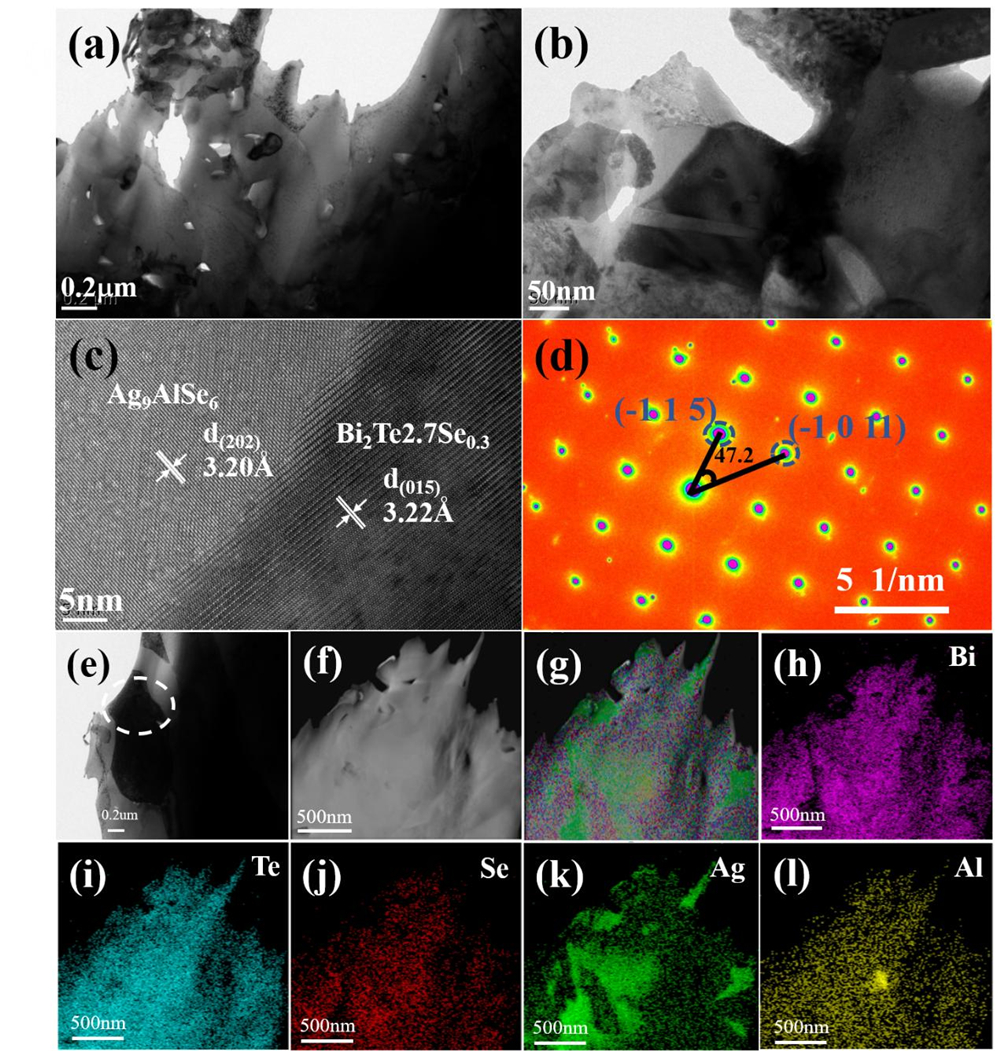 图1. (a-b) BTS-0.35vol% Ag9AlSe6的TEM图像;(c) BTS-0.35vol% Ag9AlSe6的高倍TEM图像;(d)选定区域电子衍射(SAED)(假彩色);(e-l) BTS-0.35vol% Ag9AlSe6的TEM图像和Bi、Te、Se、Ag、Al的EDS谱图。