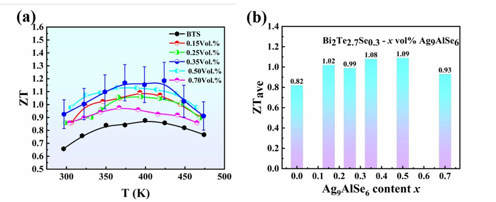 图2. BTS-xvol%Ag9AlSe6 (x=0,0.15,0.25,0.35,0.50和0.70)样品的(a)热电优值 (ZT)随温度的依赖性;(b) 平均热电优值 (ZTave)随Ag9AlSe6含量的依赖性。