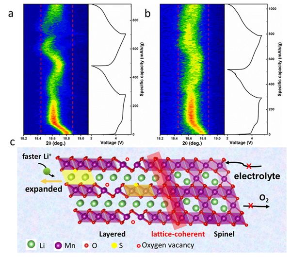 图3. (a,b) LMR和LMRS@S电极前两圈循环过程的原位XRD图;(c)改性后结构机理示意图。