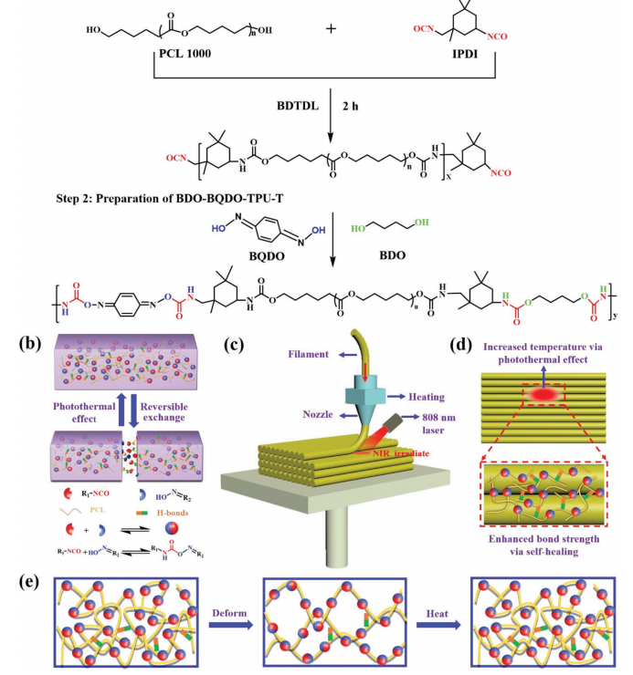 近期,北京化工大学张立群院士、卢咏来教授、王润国教授联合北京科技大学林祥团队通过在聚合物链中引入动态的肟-氨基甲酸酯键和氢键,设计并合成了一系列具有自愈合性能、固有光热效应和优良打印性能的新型热塑性聚氨酯。使用1,4-苯醌二肟(BQDO)和1,4-丁二醇(BDO)作为扩链剂,制备了一系列具有自愈性和光热性的热塑性聚氨酯材料(BDO-BQDO-TPU)。两种扩链剂的设计有效地降低了聚合物链中动态键的比例,可以实现材料的自愈性,并保证其良好的印刷性能和机械性能。动态的肟-氨基甲酸酯和氢键赋予了印刷材料在近红外辐照和直接加热下的自愈特性。由于材料固有的光热效应和自愈特性,通过在印刷过程中引入近红外辐照,沉积层的界面结合强度得到提高,从而改善了印刷产品的机械性能。材料同时具有优良的形状记忆的特性,可以通过近红外照射或直接加热有效地触发了形状记忆的恢复,并通过打印一个类似人的机器人证明了其在4D打印中的潜力。该工作以题为“Self-Healing, Photothermal-Responsive, and Shape Memory Polyurethanes for Enhanced Mechanical Properties of 3D/4D Printed Objects”的文章发表于Advanced Functional Materials上。