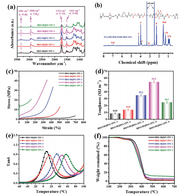 选定的扩链剂为BQDO和BDO与聚己内酯二醇(PCL)和异佛尔酮二异氰酸酯(IPDI)反应,得到具有双重自愈性的热塑性聚氨酯弹性体。动态的肟-氨基甲酸酯和可逆的氢键确保了合成材料出色的自愈特性。这种基于双链扩展器的独特设计使合成的材料具有优良的自愈性和光热效应,可以同时保证了其良好的机械性能和可打印性。BQDO扩链剂的双共轭系统改善了材料的光热效应。通过选择BDO与异氰酸酯基团反应生成稳定的聚氨酯键,减少了动态键的比例,因此合成的材料表现出了良好的热稳定性和机械性能。