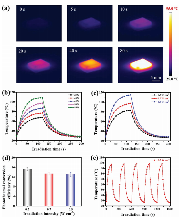 当辐照强度为0.5、0.7和0.9 W cm-2时,BDO-BQDO-TPU-4在120秒内的最高稳定温度分别达到83.3、97.8和115.7℃(图2c)。BDO-BQDO-TPU-4的光热转换效率达到15.2%(0.5 W cm-2)、13.4%(0.7 W cm-2)和13.1%(0.9 W cm-2)。与0.5 W cm-2的辐照强度相比,BDO-BQDO-TPU-4在0.9 W cm-2的强度下的最高温度增加了32.4℃。因此,通过改变近红外激光器的照射强度,可以有效地操纵光热转换后的样品温度,从而为我们后续3D打印策略的成功实施提供了坚实的基础。此外,由于近红外激光在打印过程中要沿打印路径反复照射沉积层,因此材料的光热稳定性对于打印策略的成功实施至关重要。