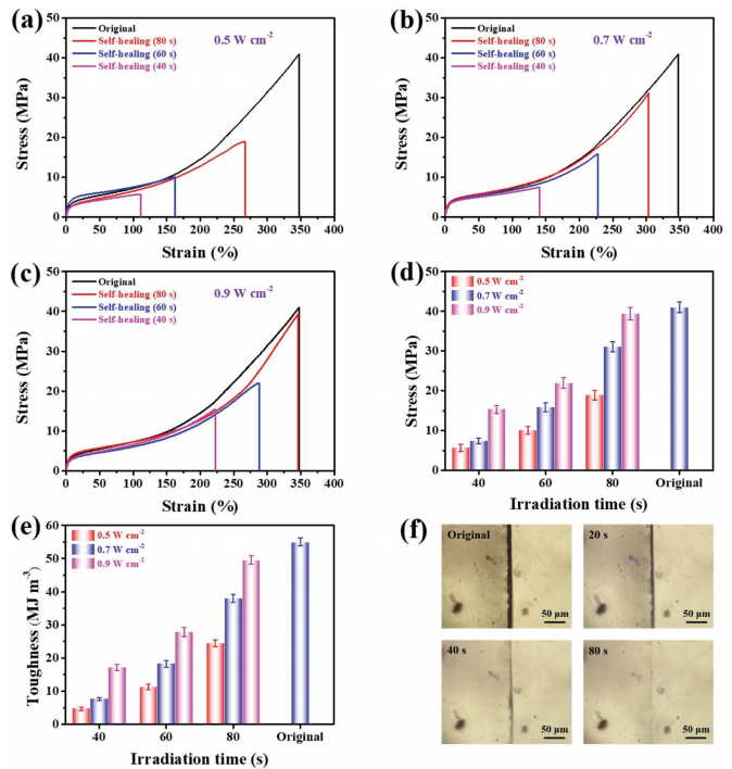 文章还探究了BDO-BQDO-TPU-4在不同强度的808nm近红外激光辐照下愈合前后的力学性能。在相同的辐照强度下,样品的拉伸强度和断裂伸长率随着辐照时间的增加而逐渐增加。当辐照强度为0.9W cm-2时,BDO-BQDO-TPU-4在愈合80秒后表现出346%的断裂伸长率和39.4MPa的拉伸强度,这与初始样品几乎一致。在相同的辐照时间下,样品的拉伸强度随着辐照强度的增加而逐渐增加。当辐照时间为60秒时,在辐照强度为0.5、0.7和0.9W cm-2时,愈合的样品的抗拉强度分别达到≈10.1、15.8和21.9MPa。愈合后的样品的韧性也显示出类似的趋势。随着辐照时间的延长和辐照强度的增加,愈合样品的韧性逐渐增加。当辐照强度为0.9 W cm-2时,愈合80s后的样品的韧性达到≈49.5 MJ m-3,愈合效率达到≈90%。光学显微镜图像显示,裂缝在80秒内几乎完全消失了。这些结果显示了BDO-BQDO-TPU-4出色的自我修复性能。