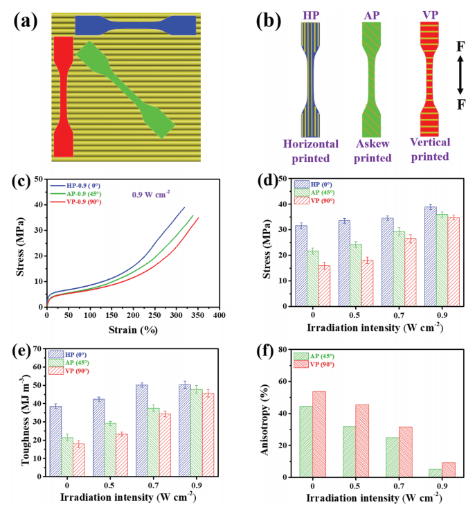 由于打印过程的设置使得打印的材料具有各向异性,因此采用水平打印(HP),斜角打印(AP)和垂直打印的方式综合评估材料的力学性能。当辐照强度达到0.9W cm-2时,与没有近红外辐照的印刷样品相比,HP-0.9、AP-0.9和VP-0.9在相应方向的韧性分别增加了30.3%、122%和155%。这表明这一种打印策略在提高印刷物的机械性能方面的有效性。值得注意的是,策略中使用的近红外辐照强度明显低于以前的报道,从而避免了印刷过程中材料的降解。