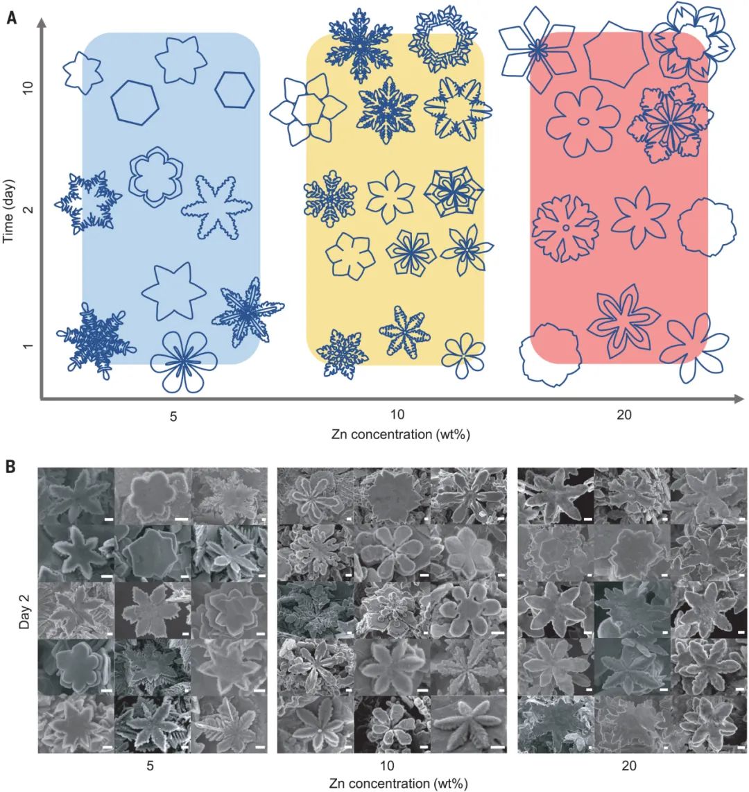 也许晶体生长最令人着迷的例子是六棱体状冰晶(雪花)的形成。虽然它们彼此不同,但雪花构成了高度对称的六棱体枝晶、板状、棱柱状和针状结构。雪花状晶体的形成依赖于水分子从过饱和的气相有序聚集到分子相互作用主导的晶面。人造雪花的合成使人们对结晶过程有了现象级的理解。雪花的六重对称性源于冰晶晶格的六边形排列以及环境生长条件,包括温度和湿度,进而决定了晶体的形貌。雪花晶体的形态演化只是在许多天然和合成体系中发现的高度复杂的晶体生长行为的一个例子。