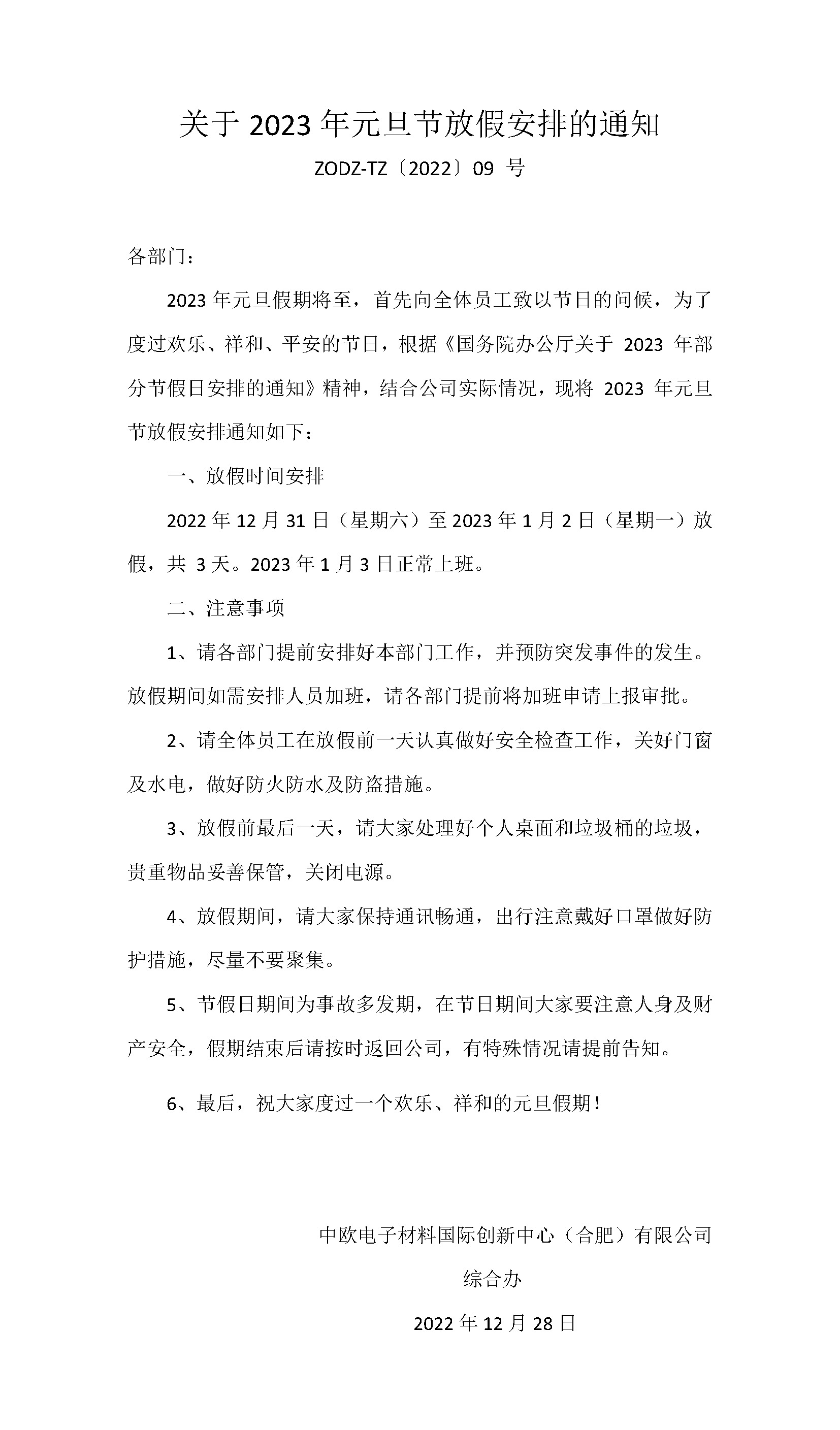 赢博在线(中国)唯一官方网站2023 年元旦节放假安排的通知