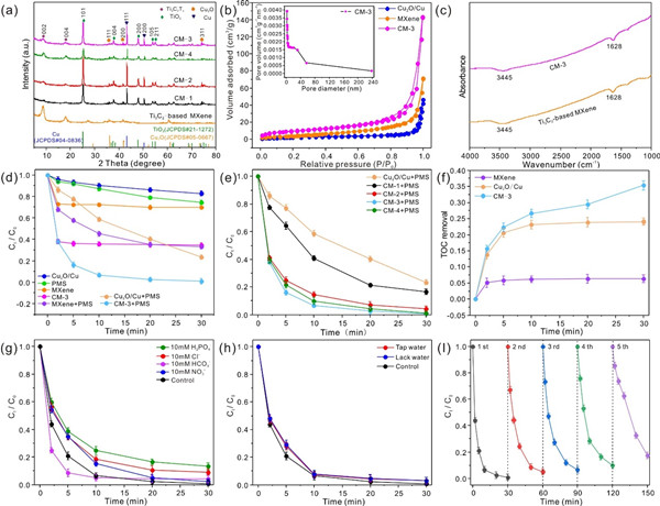 近期,中科院合肥研究院固体所环境材料与污染控制研究部孔令涛研究员团队提出了一种基于纳米限域结构的强化催化策略,在多层结构的MXene上原位生长纳米级的Cu2O/Cu,实现对水中四环素污染物降解效能的显著增强。相关研究成果以“Efficient degradation of tetracycline by a novel nanoconfinement structure Cu2O/Cu@MXene composite”为题,发表在Journal of Hazardous Material (J. Hazard. Mater., 2023, DOI: 10.1016/j.jhazmat.2023.130995)上。 近年来,铜氧化物由于适用pH范围宽、毒性低和储量丰富等优点受到了广泛的关注。然而,单一的铜氧化物材料在实际应用中存在易团聚、循环稳定性差及催化效率低等缺陷。为了解决这些问题,将纳米铜氧化物与载体结合形成具有“纳米限域结构”的复合材料是最为有效的策略之一。新型二维层状材料MXene层间距可控,且具有良好的生物相容性、表面负电性及良好的亲水性,是一种潜在的纳米约束支撑基底。