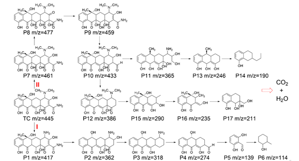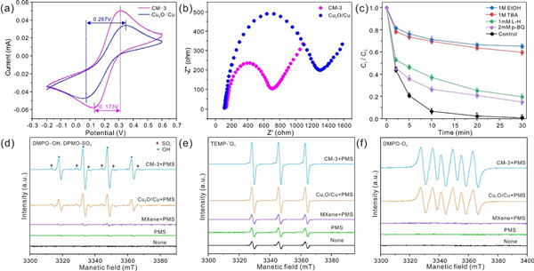鉴于此,研究人员将MXene与铜氧化物Cu2O/Cu结合,成功构筑了具有纳米限域结构的新型催化剂Cu2O/Cu@MXene,并选择四环素作为降解目标,研究了Cu2O/Cu@MXene的催化降解性能。结果表明,在最佳降解条件下,四环素的去除效率在30 min内达到了99.14%,准一级动力学常数为0.1505 min-1,是Cu2O/Cu的3.2倍。这种出色的催化性能主要归因于Cu2O/Cu@MXene中的MXene能够促进四环素的吸附和Cu2O/Cu纳米颗粒之间的电子传输。EPR分析和猝灭实验表明,Cu2O/Cu@MXene/PMS体系中的主要活性氧物种是.OH。基于LC-MS监测到的降解中间体,研究人员提出了在这种非均相类芬顿体系中去除四环素的两种可能路径。该研究为设计环境友好、催化活性高的类芬顿催化剂提供了纳米约束构建策略,进一步拓宽了MXene在高级氧化领域的应用。 上述工作得到了国家重点研究开发计划、国家自然科学基金、安徽省自然科学基金及合肥研究院院长基金等项目的资助。