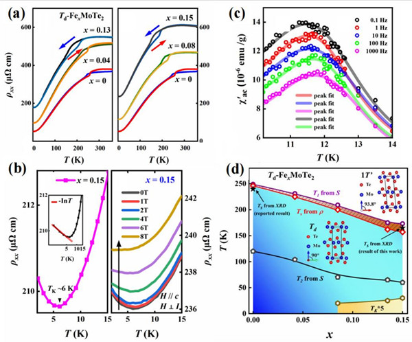 图. (a) 不同Fe插层量样品Td-FexMoTe2电阻率随温度变化;(b) Td-Fe0.15MoTe2低温电阻率在不同磁场下随温度变化;(c)交流磁化率虚部的峰值随频率变化;(d) FexMoTe2的电子相图。