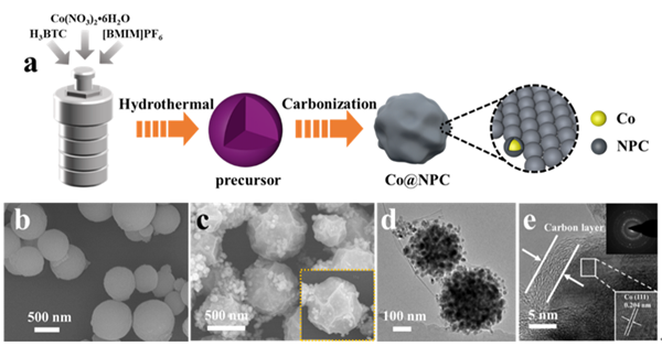 图1. Co@NPC的(a)合成示意图、(b-c) SEM图、(d) TEM图、(e) HRTEM图。