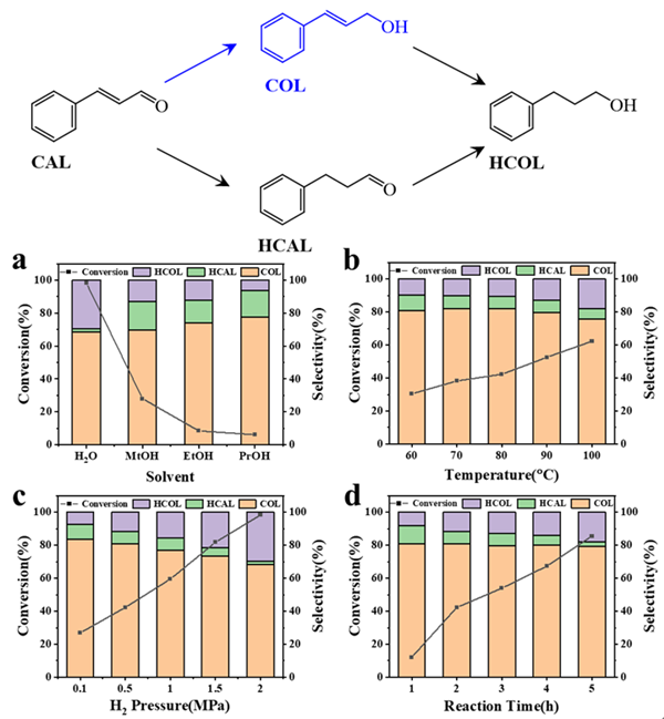 图2. Co@NPC反应性能:转化率及选择性随(a)溶剂、(b)温度、(c)氢压、(d)时间变化图。