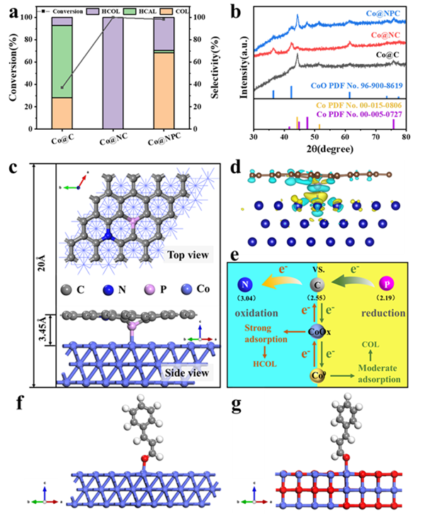 图3. (a) Co@C、Co@NC和Co@NPC的催化性能;(b) 三种不同催化剂的XRD图谱;(c) Co@NPC计算模型侧视图和俯视图; (d) Co@NPC催化剂的电荷密度差图;(e) 催化剂中的电子转移途径;(f) Co表面和(g) CoO表面吸附肉桂醛的示意图。