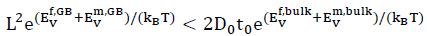 在该方程左端,L为晶粒尺寸,EVf,GB和EVm,GB分别为晶界内的空位形成能和迁移能垒,其可用于描述晶界特征。在方程右端,EVf,bulk和EVm,bulk分别为块体内的空位形成能和迁移能垒,对于给定体系,其为常量。满足该方程时,通过沿晶界的缺陷巡游使得原本在高能级区域出现的缺陷发射过程被抑制,进而导致材料辐照响应与缺陷-晶界结合强度之间的不确定性(图4)。