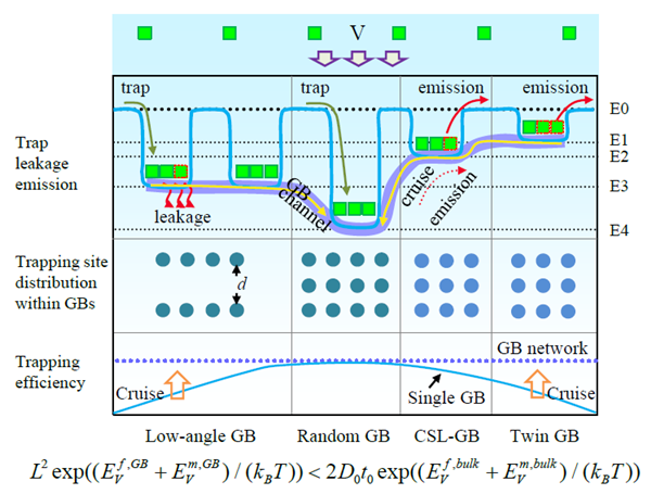 图4. 单晶界和晶界网络附近空位演化示意图。E0–E4表示晶界内空位能级。主要过程包括晶界处空位捕获、发射、泄露、巡游以及晶粒尺寸和晶界特征耦合抑制的晶界发射。