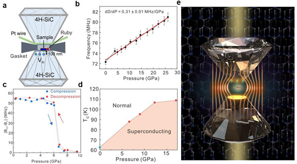 该实验发展了基于固态色心自旋的高压原位磁探测技术。相对于金刚石,碳化硅材料加工工艺成熟,可大尺寸生长和制备,价格便宜,其制备的压砧在低压区可以提供更大的样品体积。在这些碳化硅压砧中集成磁传感器为高压超导磁探测以及磁性材料相变研究提供了一个优异的研究平台。