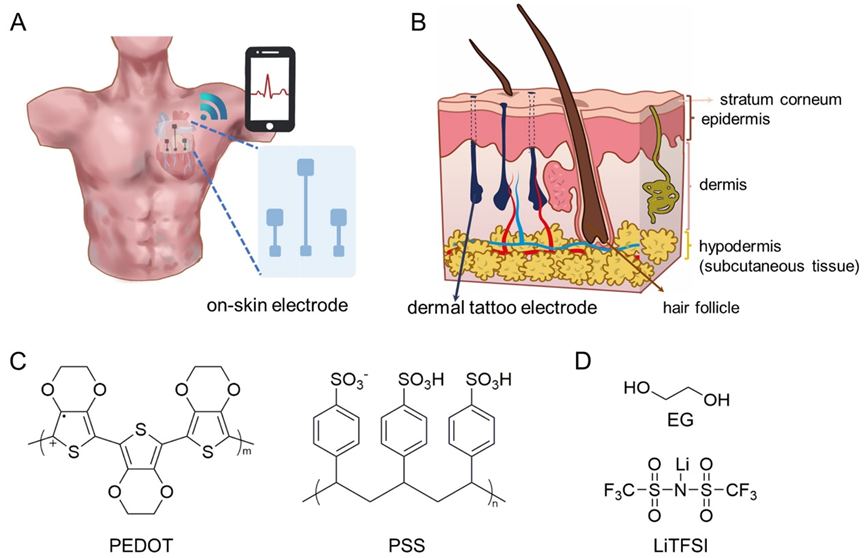 皮肤集成电子因其在个性化健康管理、通讯和人机交互等多领域的应用潜力而受到广泛关注。其中,“纹身电子”(表皮电子)泛指一种可直接贴在皮肤上的柔性贴片,具有临时纹身的轻松、舒适等特点。纹身,将墨水或染料颜料注入皮肤真皮层,是一种已普遍存在的身体修饰技术。迄今已报道的“纹身电子”大多以皮肤表面集成的形式呈现,而使用真皮纹身实现电生理信号的精确诊断是一种尚未探索的皮肤集成电子范式。