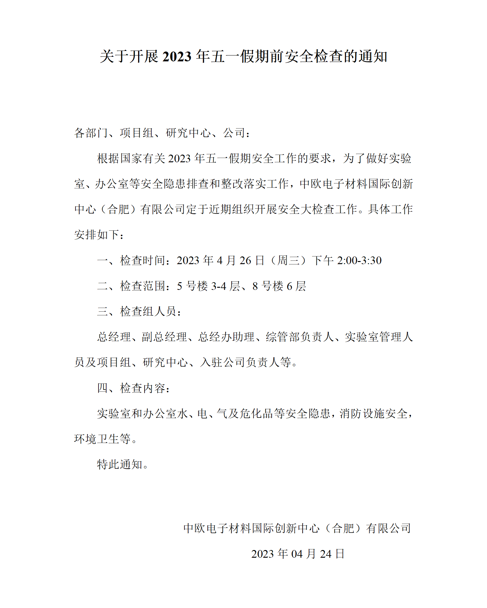 赢博在线(中国)唯一官方网站开展2023年五一假期前安全检查的通知