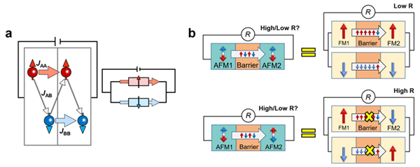 图1. (a) 反铁磁材料的“并联电路”模型和其中的奈尔自旋流;(b) 基于奈尔自旋流,反铁磁隧道结可被近似地看成两个铁磁隧道结的并联。