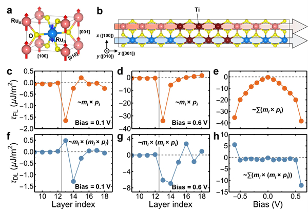 图2. RuO2/TiO2/RuO2 (001) 反铁磁隧道结中由奈尔自旋流驱动的自旋转移力矩。