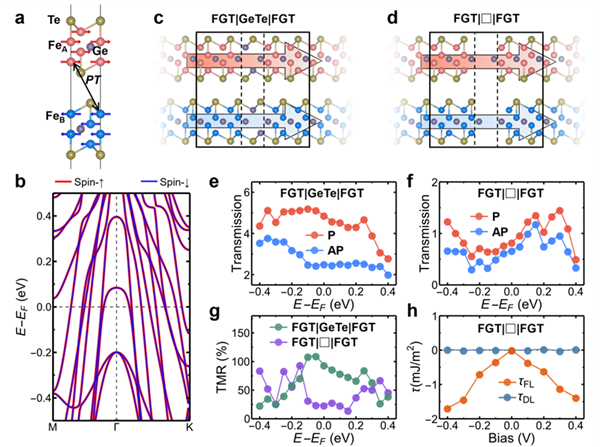 图3. 基于自旋简并反铁磁材料Fe4GeTe2的反铁磁隧道结中由奈尔自旋流驱动的隧道磁阻和自旋转移力矩。
