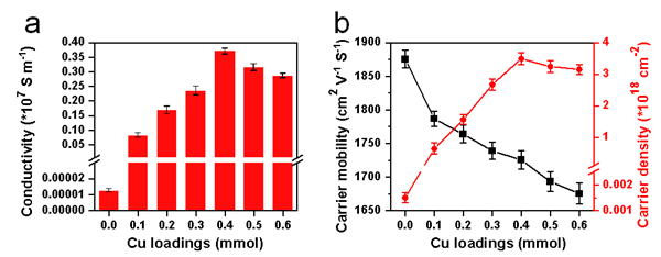 图2.(a)不同铜含量的石墨烯电导率;(b)不同铜含量的石墨烯载流子迁移率和载流子密度。