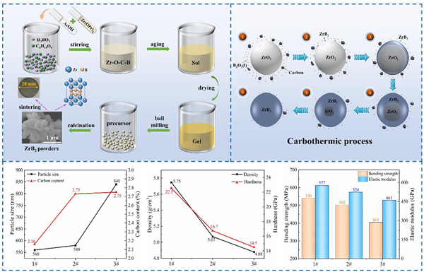 图1. ZrB2陶瓷粉体的制备工艺流程图、晶粒生长示意图及粉体的烧结性能表征。