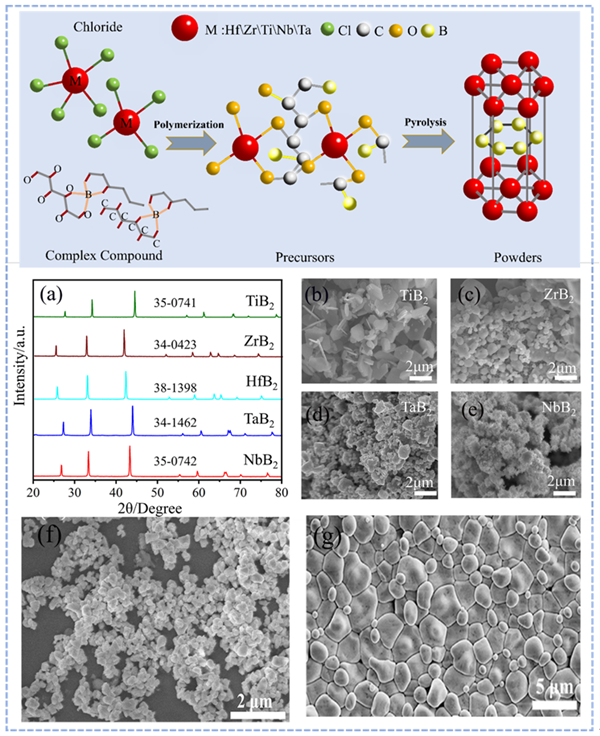 近期,中科院合肥物质院固体所纳米材料与器件技术研究部李越研究员团队与哈尔滨工业大学张幸红教授团队合作,在超细、高纯超高温陶瓷粉体制备与机理研究方面取得新进展,发展了一种液相陶瓷前驱体-碳/硼热还原新工艺,该工艺可实现批量化制备多种高纯、超细硼化物陶瓷粉体。相关成果相继发表于材料领域国际期刊Journal of Materials Science & Technology和ACS Applied Engineering Materials等。 硼化物超高温陶瓷及其复合材料由于其优异的综合理化特性,已成为空间飞行器在极端热环境服役中重要的候选材料。其中,ZrB2、HfB2因其极高的熔点(超过3000°C)、高抗氧化性和优异的耐腐蚀性而受到广泛关注。研制高性能硼化物陶瓷材料的关键是获得高性能的陶瓷粉体。一般来说,超细粒径、高纯度和低氧含量的陶瓷粉体不仅有利于低温烧结过程中块材的致密化,还可以避免对陶瓷基复合材料基体的损伤,从而提升陶瓷基复合材料的抗氧化性和机械性能。传统的机械化合金、高温自蔓延等方法难以获得同时具有高纯度和超细粒径的硼化物陶瓷粉体。因此,亟需研发出新工艺实现高纯和超细粒径硼化物陶瓷粉体的工程化制备,为硼化物陶瓷基复合材料性能的提升提供原材料。为此,固体所陶瓷粉体研究团队经过长期攻关,开发了一种液相前驱体-碳/硼热还原的工艺路线,成功制备了IV-VI族过渡金属的单元/多元/中高熵陶瓷粉体,并实现了高纯超细ZrB2、HfB2陶瓷粉体的工程化制备。