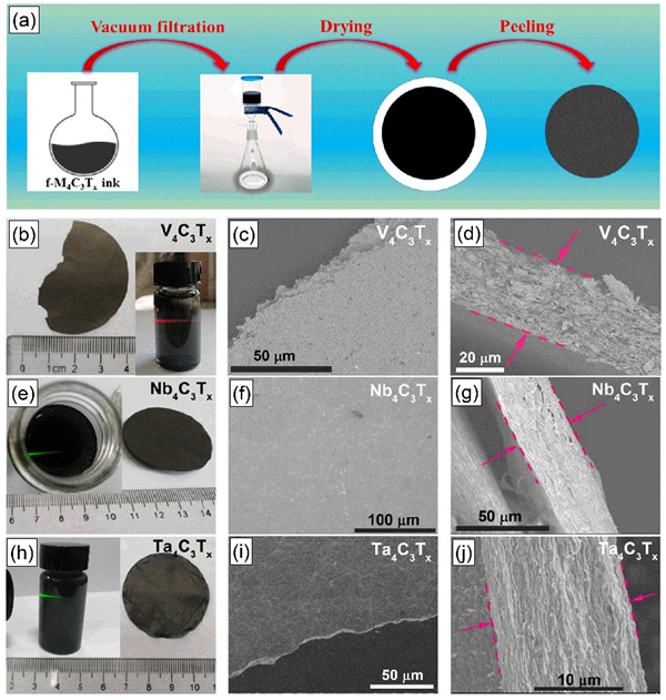 图3. 少层M4C3Tx (M = V, Nb) MXene自支撑膜的制备工艺示意图及相应少层MXene墨水、自支撑膜的照片和电镜表征结果。