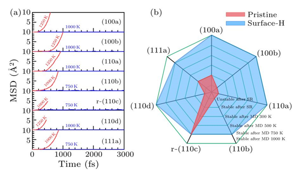图1. (a) 氢饱和表面在结构坍塌前(蓝线)后(红线)温度下的分子动力学均方位移;(b) 纯净表面和氢饱和表面在结构弛豫和有限温度下(最高达1000 K)的分子动力学模拟中的稳定性,雷达图不同的环表示不同的不稳定性,更外侧的环是更稳定的,r-(110c) 表示具有表面重构的110c表面。