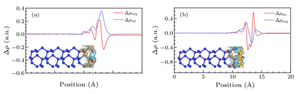 图2. (a)和(b)分别展示了氢吸附的111a表面和羟基吸附的111a表面的电荷密度差。图中的曲线沿晶体结构(如插图所示)的 z 方向绘制,红线所示的局部积分曲线表示获得(正值)和失去(负值)电子,蓝线所示的积分曲线是红线的积分。