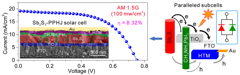鉴于此,研究团队提出了并联平板异质结(PPHJ)太阳电池策略。PPHJ策略保留了传统串联多层PHJ制备的便捷性,但消除了串联及并联串联PHJ体系中载流子复合层和多重电极制备的困难和复杂性。基于PPHJ策略,研究团队首次制备了Sb2S3基PPHJ电池,并创造了新的Sb2S3太阳电池光电转换效率纪录(8.32%)。该研究为低成本和高效的部分或全无机太阳电池提供了新的设计概念。