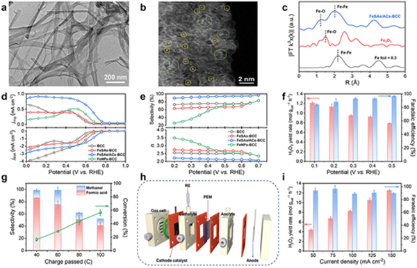 图1. (a)FeSAs/ACs-BCC的TEM图;(b)球差校正的HAADF-STEM图;(c)FeSAs/ACs-BCC样品和标准对照样品的Fe K边R空间EXAFS光谱图;(d)FeSAs/ACs-BCC和对照催化剂的LSV曲线;(e)根据LSV数据所计算的H2O2选择性和转移电子数(n);(f)不同电位下FeSAs/ACs-BCC在H-型电解池中H2O2的生成速率及相应的法拉第效率;(g)通过不同电荷后乙二醇的转化率和产物选择性;(h)流动池装置示意图;(i)不同电流密度下FeSAs/ACs-BCC在流动池中H2O2的生成速率及相应的法拉第效率。