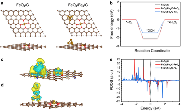 图2.(a)FeO4/C和FeO4/Fe4/C的优化结构模型(上:俯视图,下:前视图);(b)DFT计算2e- ORR路径的吉布斯自由能图;(c)FeO4/Fe4/C的差分电荷密度图;(d)FeO4/Fe4/C吸附*OOH中间体的差分电荷密度图;(e)FeO4、FeO4/Fe4/C-FeO4和FeO4/Fe4/C-Fe4中Fe原子d轨道的投影态密度图。