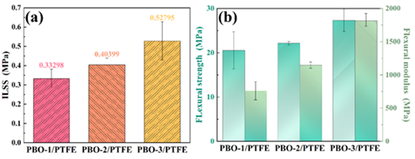 图3. 不同PBO纤维/PTFE透波层合复合材料的ILSS(a)和FS(b)。