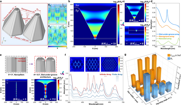 图2. 金属“锥形纳米槽-隙阵列”的设计及FDTD模拟结果。上槽中激发的2D间隙表面等离激元模式和在下隙中激发的局域表面等离激元共振模式相互耦合,实现了大模式空间分布的强耦合场增强。