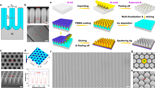 图3. 金属“锥形纳米槽-隙阵列”的制备流程示意图及其形貌结构表征结果。