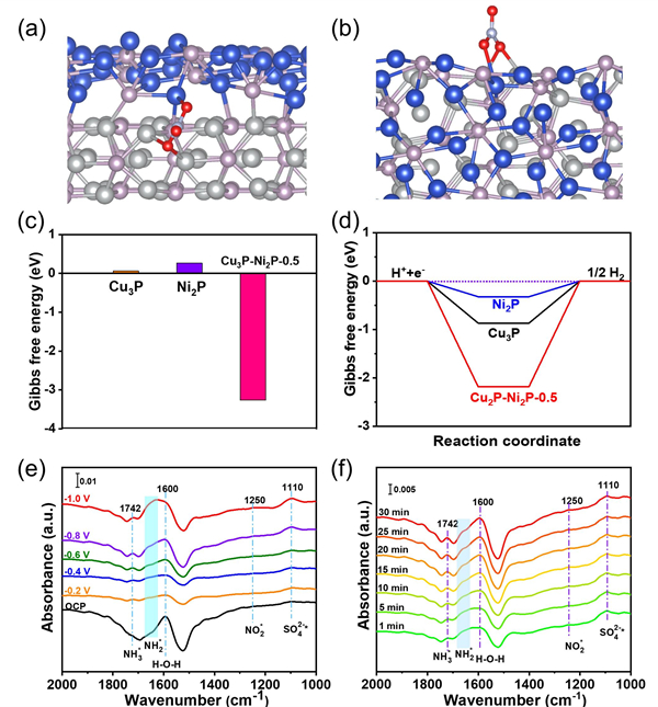 图2. NO3-吸附在Cu3P-Ni2P-0.5催化剂上的结构示意图(a)俯视图,(b)侧视图;(c)NO3-吸附自由能和(d)HER反应自由能;(e)Cu3P-Ni2P/CP-0.5催化剂在不同电位下原位ATR-IRRAS光谱图;(f)在-0.6 V(vs. RHE)电位下,原位ATR-IRRAS随时间变化的光谱图。