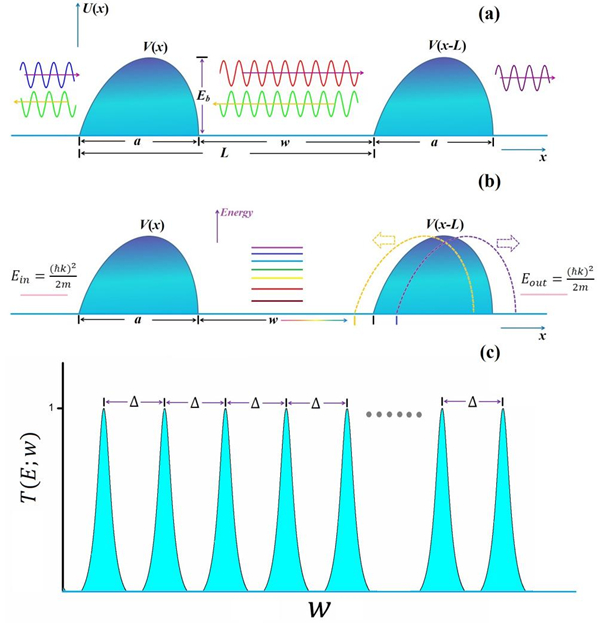 图1. (a) 双势垒之间的量子干涉及隧穿现象;(b) 通过改变势垒间距调控共振能级;(c) 给定能量下的量子隧穿概率随势垒间距的分布。
