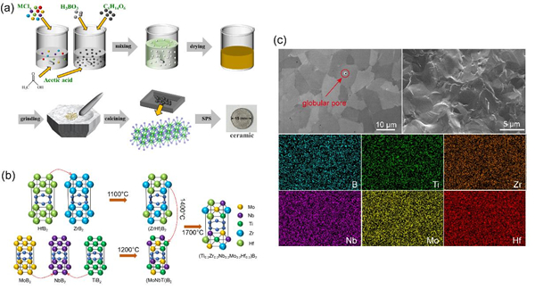 图1. TZNMH高熵硼化物的制备流程与微观结构:(a) 制备工艺示意图;(b) TZNMH高熵硼化物固溶机理示意图;(c) SEM扫描图及元素成像。
