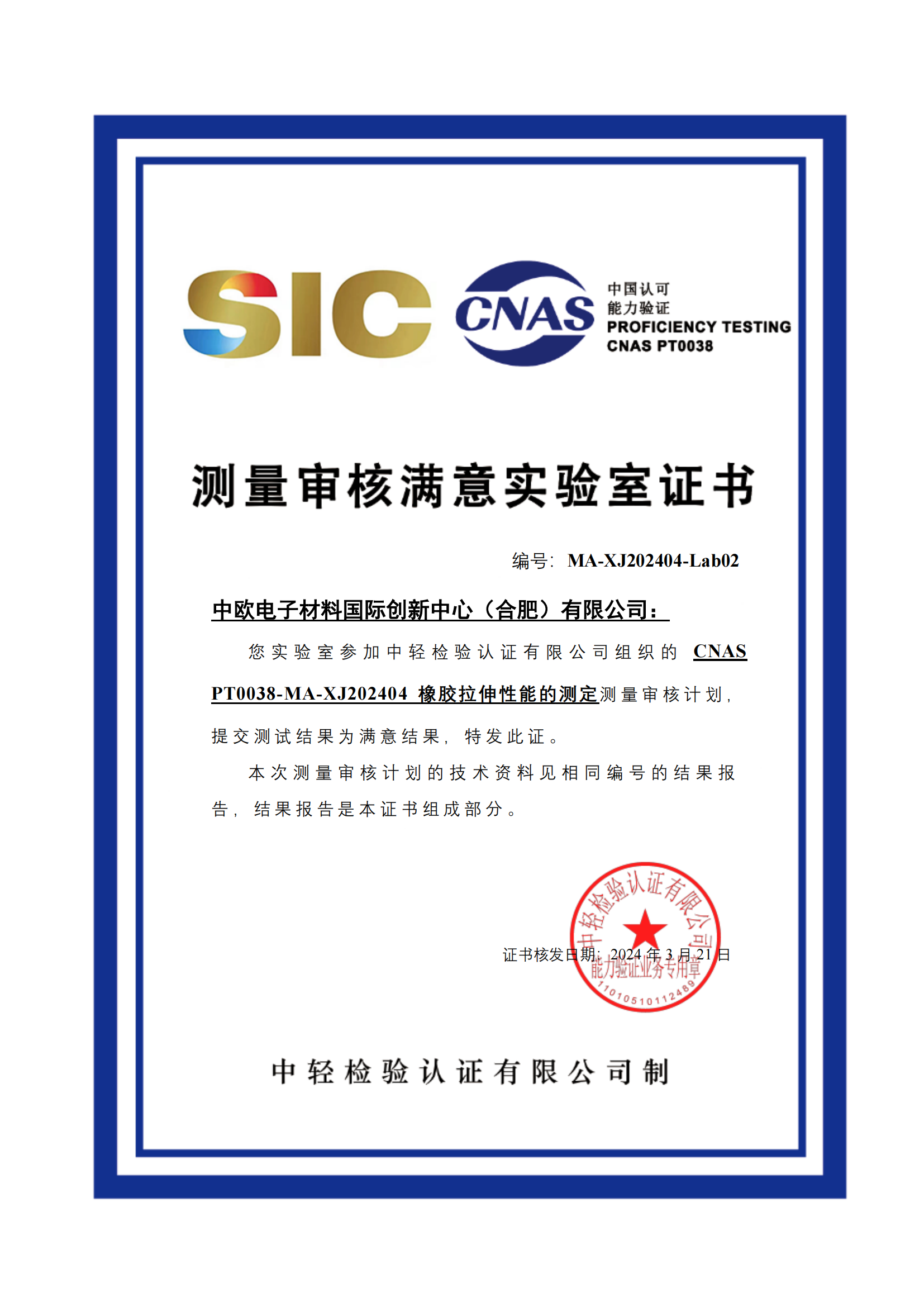 近日,赢博在线(中国)唯一官方网站测试技术赢博在线(中国)唯一官方网站实验室参加了CNAS PT 0038-MA-XJ202404 能力验证,顺利通过橡胶拉伸性能测定,取得满意成绩(z值为0.66),通过能力验证,并获得CNAS测量审核实验室证书。